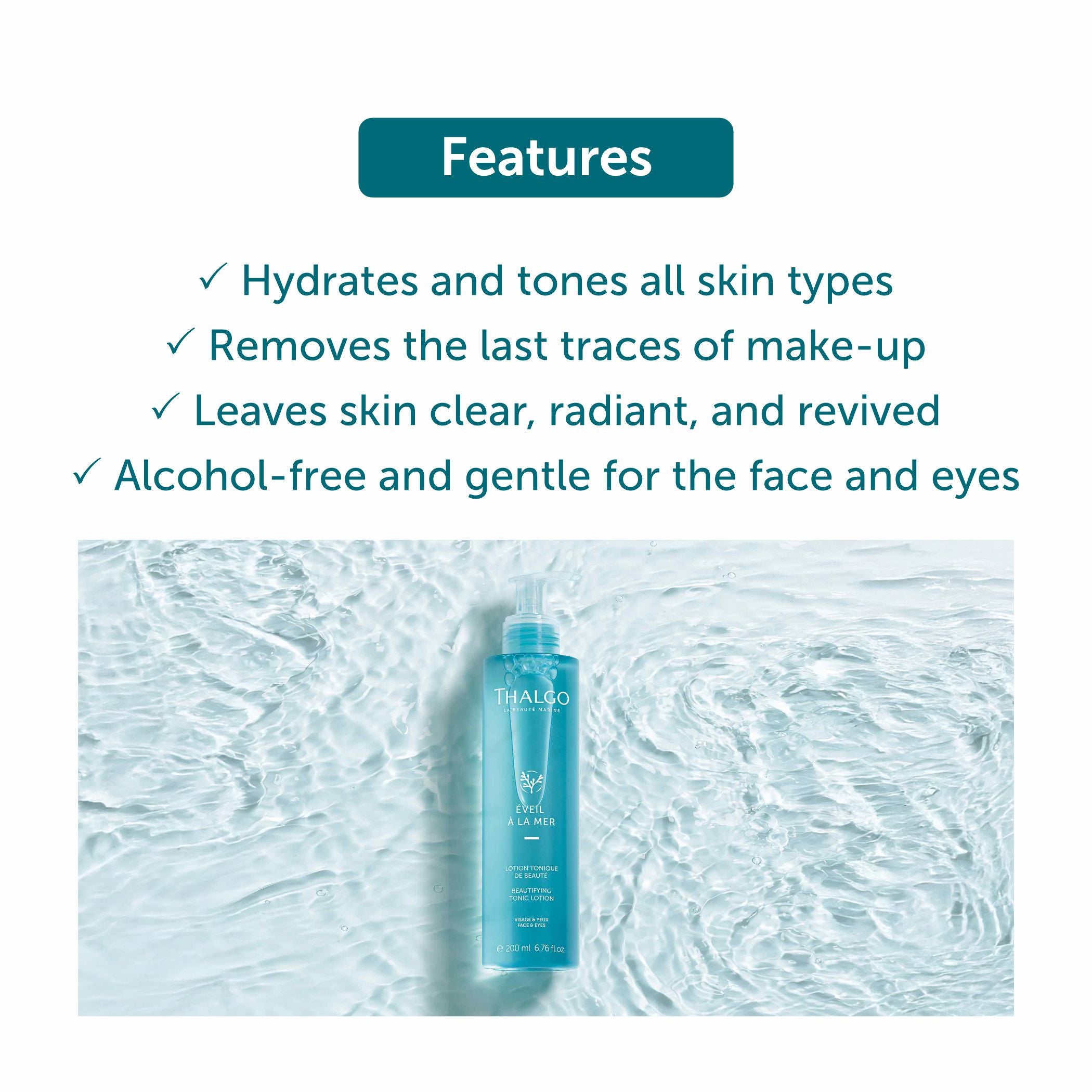 - Thalgo Beautifying Tonic Lotion is alcohol-free, making it perfect for use on both your face and eyes, delivering hydration without irritation.