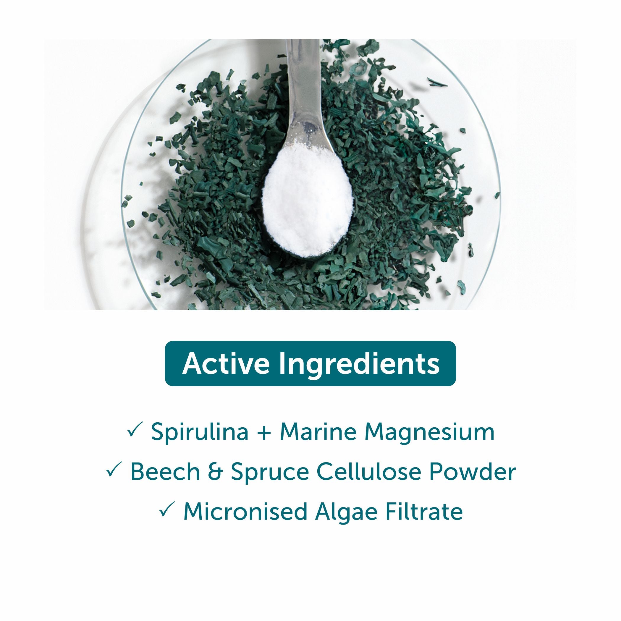 - Combines Spirulina, marine Magnesium, and Hyaluronic Acid for revitalised skin.